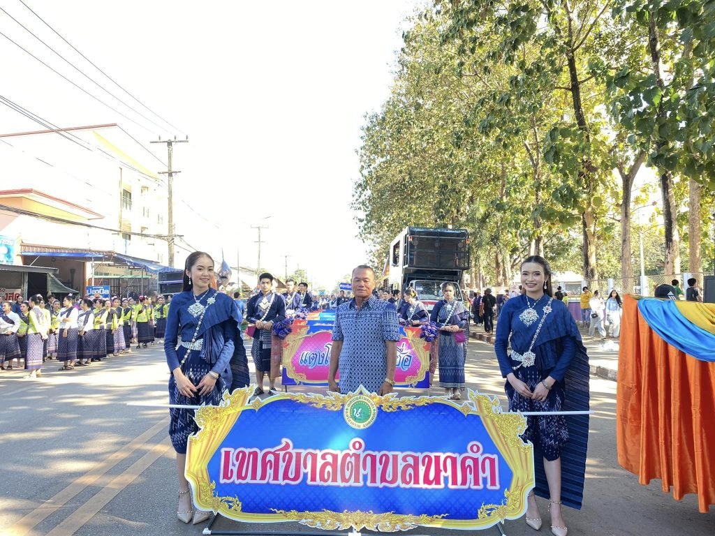ภาพขบวนแห่ตำบลนาคำ “หุ่นปลาเสือตาลายเล็ก” นำโดย นายสุบิน สมรฤทธิ์ นายกเทศมนตรีตำบลนาคำ
