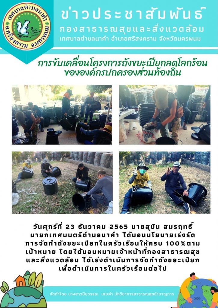กองสาธารณสุขและสิ่งแวดล้อม ได้รับมอบหมายจาก นายสุบิน สมรฤทธิ์ นายกเทศมนตรีตำบลนาคำ ให้เร่งดำเนินการจัดทำถังขยะเปียกเพื่อให้ประชาชนนำไปจัดทำถังขยะเปียกลดโลกร้อน ให้ครบ 100% ตามเป้าหมาย