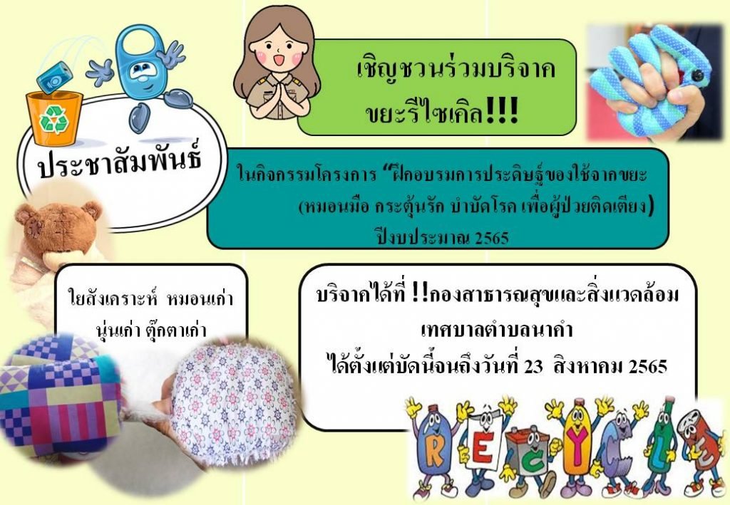 เชิญชวนร่วมบริจาคขยะรีไซเคิล ใยสังเคราะห์ หมอนเก่า นุ่นเก่า ตุ๊กตาเก่า บริจาคได้ที่ กองสาธารณสุขและสิ่งแวดล้อม เทศบาลตำบลนาคำ ได้ตั้งแต่บัดนี้จนถึงวันที่ 23 สิงหาคม 2565