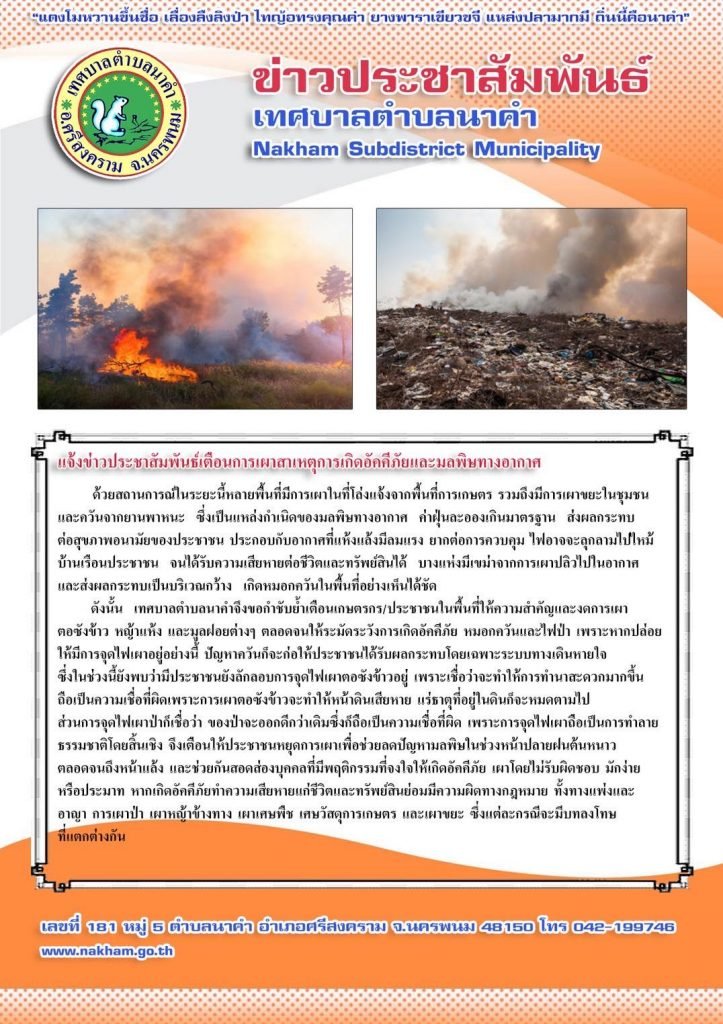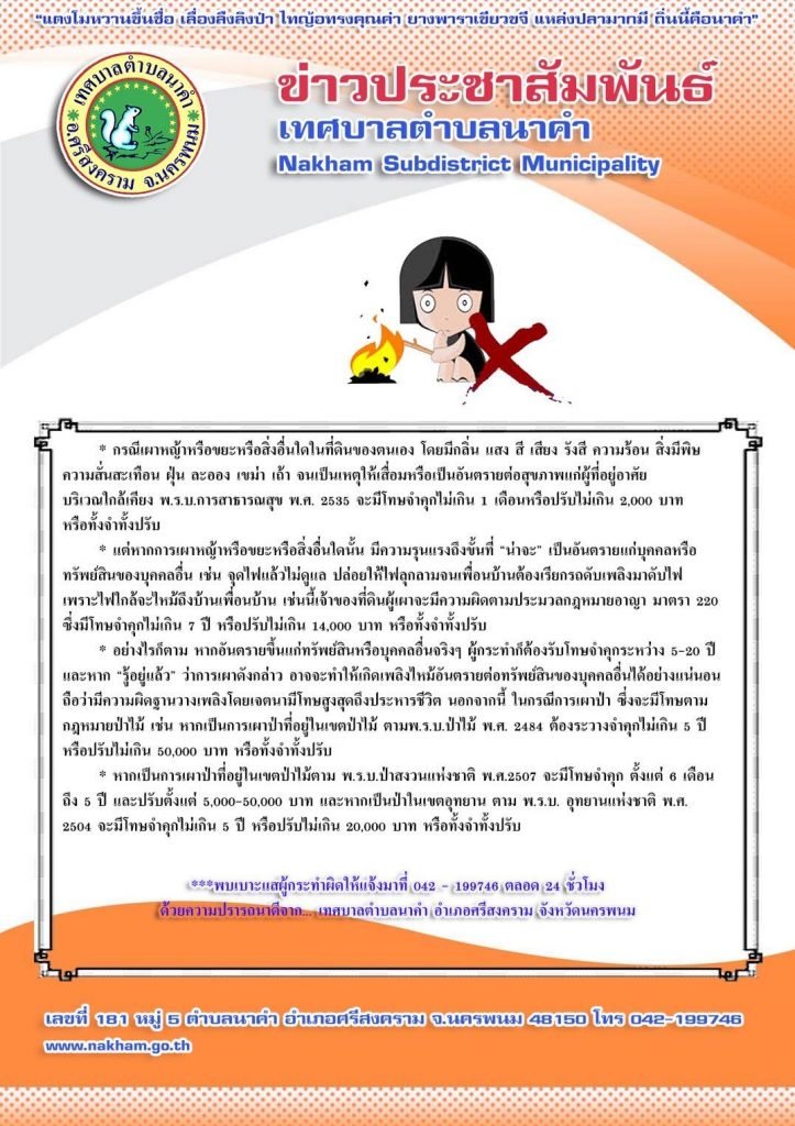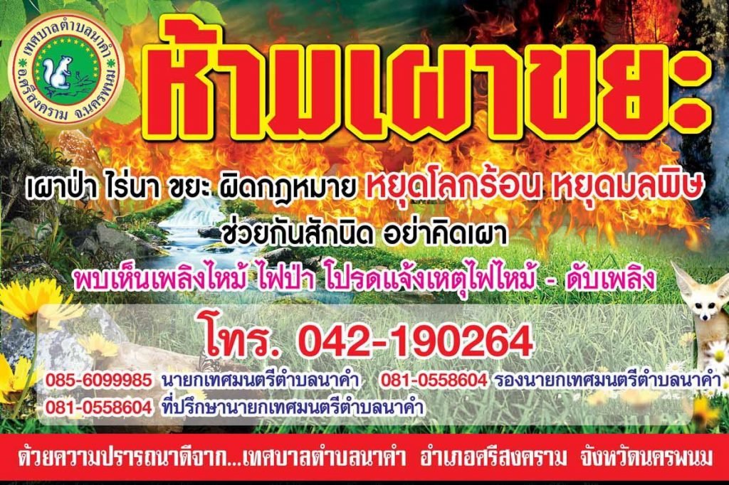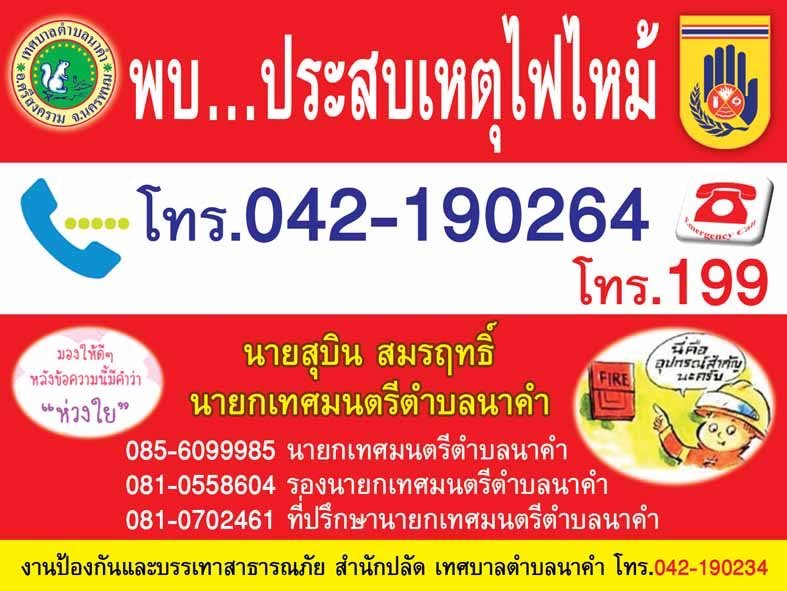 ประชาสัมพันธ์ พบเห็นเพลิงไหม้ ไฟป่า โปรดแจ้งเหตุไฟไหม้ - ดับเพลิง โทร 042-190264 ตลอด 24 ชั่วโมง ด้วยความปรารถนาดีจาก เทศบาลตำบลนาคำ อำเภอศรีสงคราม จังหวัดนครพนม