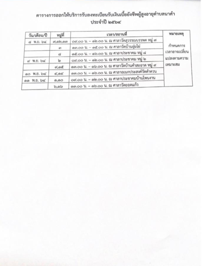 วันจันทร์ ที่ 8 พฤศจิกายน 2564 เวลา 09.00 เป็นต้นไป เทศบาลตำบลนาคำ กองสวัสดิการสังคม ออกหน่วยบริการรับลงทะเบียนผู้มีสิทธิรับเบี้ยยังชีพผู้สูงอายุ ประจำปีงบประมาณ 2566 ณ บ้านภูกระแต หมู่ 7 หมู่ 12 หมู่ 13 บ้านอุ่มไผ่ หมู่ 3 และบ้านโนนรัง หมู่ 8 รายละเอียดสถานที่ วัน เวลา ออกให้บริการรับลงทะเบียนดังนี้