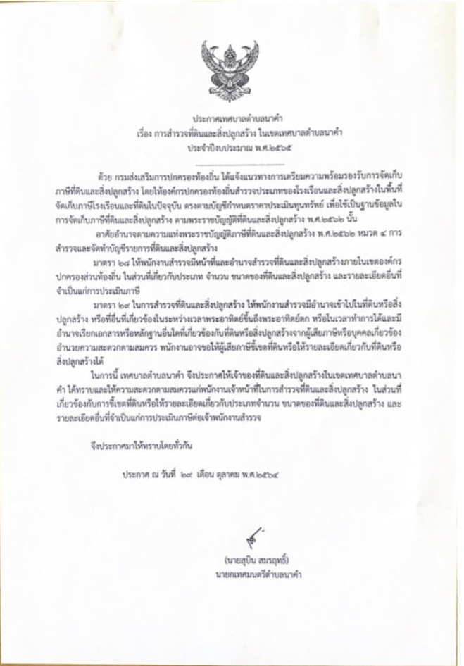 ประกาศการสำรวจที่ดินและสิ่งปลูกสร้าง ในเขตเทศบาลตำบลนาคำ ประจำปีงบประมาณ พ.ศ.2565