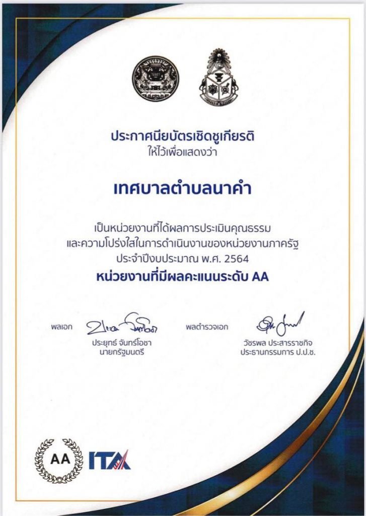 ประกาศนียบัตรเชิดชูเกียรติ ให้ไว้เพื่อแสดงว่าเทศบาลตำบลนาคำ เป็นหน่วยงานที่ได้รับการประเมินคุณธรรมและความโปร่งใสในการดำเนินงานของหน่วยงานภาครัฐ ประจำปีงบประมาณ พ.ศ. 2564