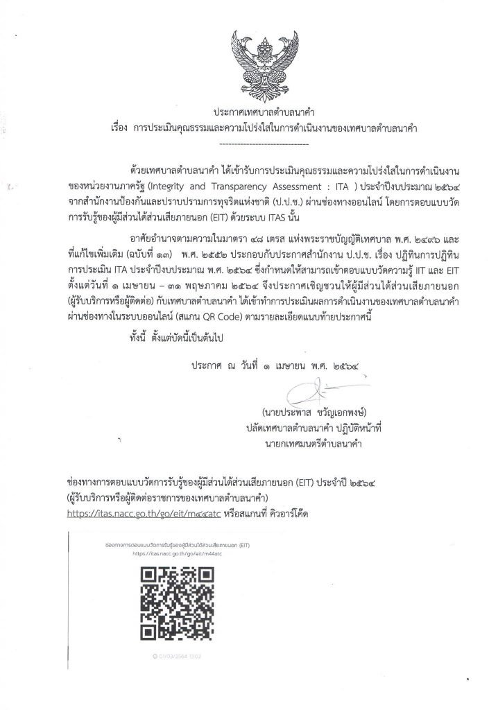 เชิญชวนให้ผู้มีส่วนได้เสียภายนอก (ผู้รับบริการหรือผู้ติดต่อ) กับเทศบาลตำบลนาคำ ได้เข้าร่วมการประเมินผลการดำเนินงานของเทศบาลตำบลนาคำ ผ่านช่องทางในระบบออนไลน์ (สแกน QR code)
