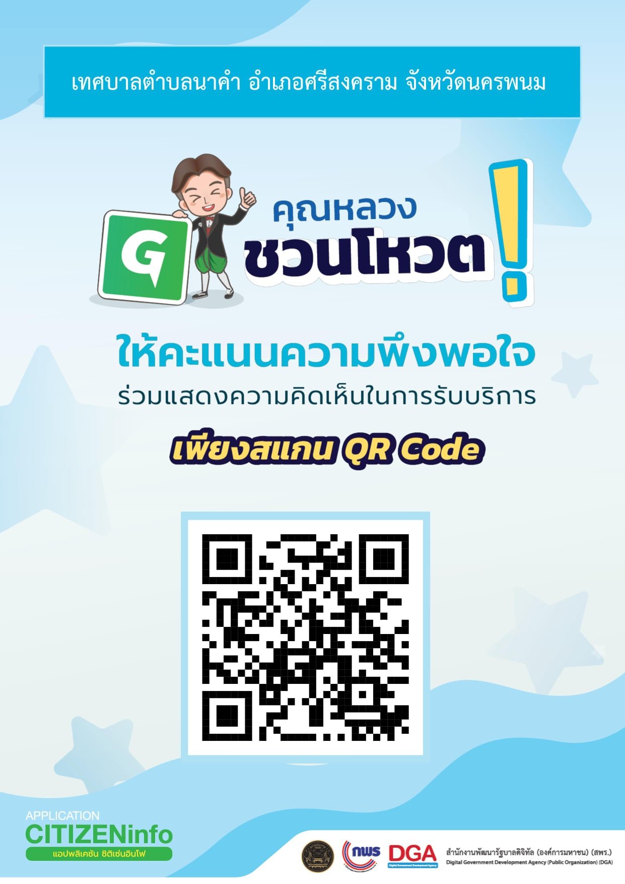 ประชาสัมพันธ์ร่วมให้คะแนนความพึงพอใจและร่วมแสดงความคิดเห็นในการรับบริการของเทศบาลตำบลนาคำ (CITIZENinfo Backend) ✍️✍️ เพียงสแกน QR Code