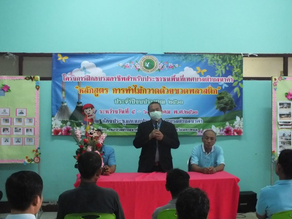 วันที่ 4 สิงหาคม 2563 กองสวัสดิการสังคม เทศบาลตำบลนาคำ ดำเนินโครงการฝึกอบรมอาชีพสำหรับประชาชนพื้นที่เทศบาลตำบลนาคำ "หลักสูตรการทำไม้กวาดจากขวดพลาสติก" ประจำปีงบประมาณ 2563 ระหว่างวันที่ 4-5 สิงหาคม 2563 ณ อาคารที่ทำการชมรมผู้สูงอายุ ตำบลนาคำ อำเภอศรีสงคราม จังหวัดนครพนม