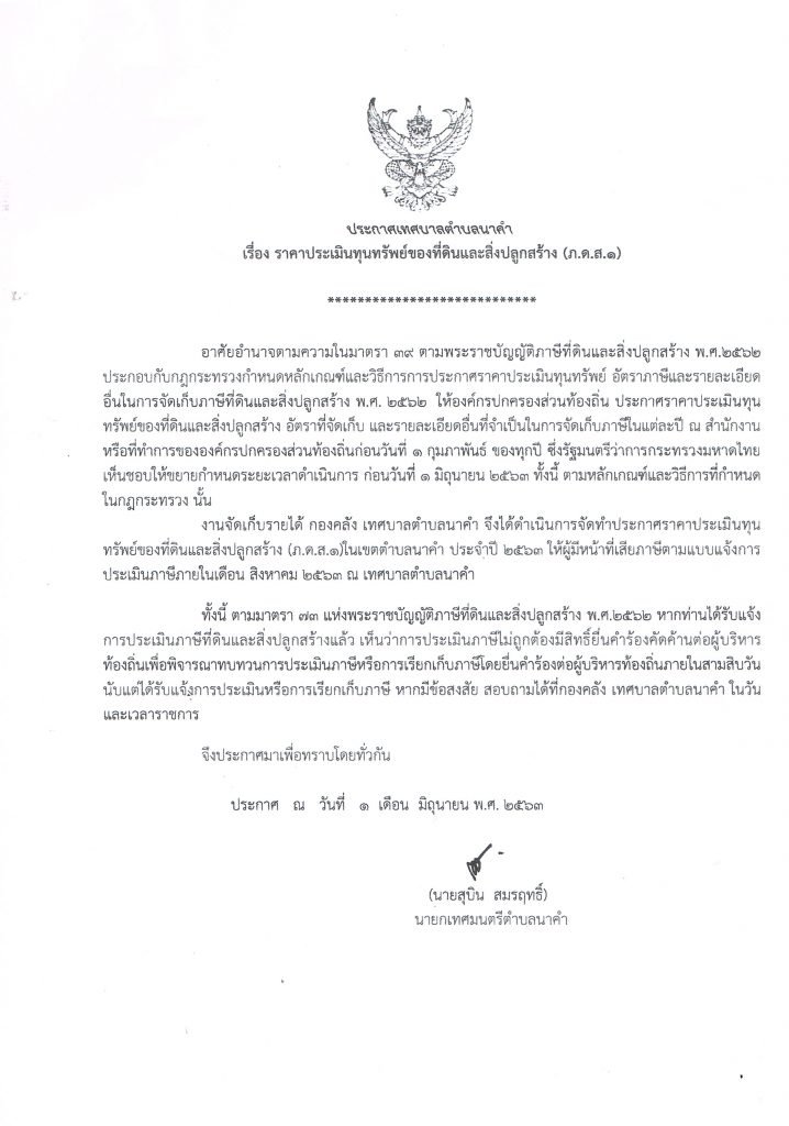 ประกาศเทศบาลตำบลนาคำ เรื่อง ราคาประเมินทุนทรัพย์ของที่ดินและสิ่งปลูกสร้าง (ภ.ด.ส.1)