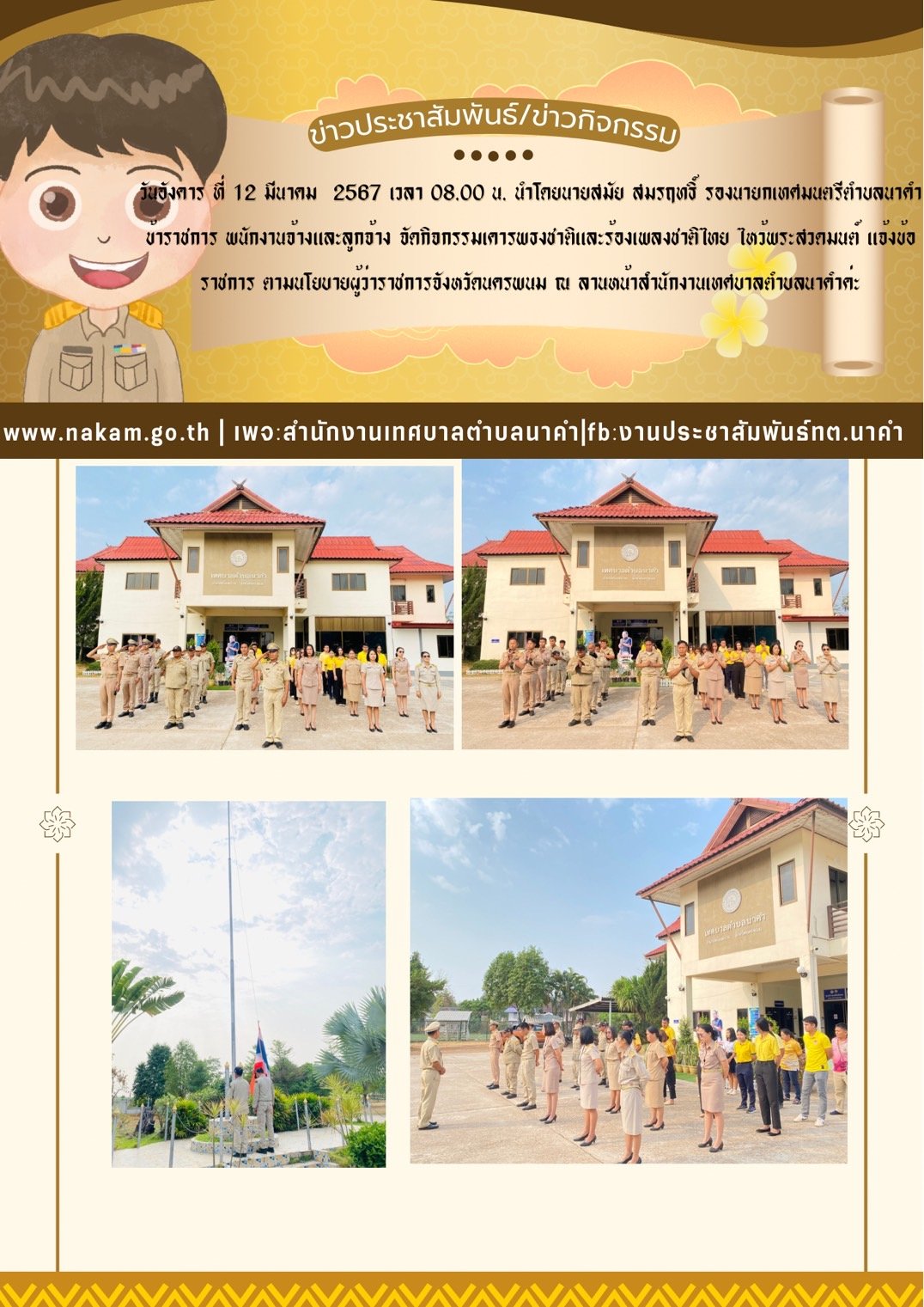 วันอังคาร ที่ 12มีนาคม 2567 เวลา 08.00 น. นำโดยนายสมัย สมรฤทธิ์ รองนายกเทศมนตรีตำบลนาคำ2 พร้อม ข้าราชการ พนักงานจ้างและลูกจ้าง จัดกิจกรรมเคารพธงชาติและร้องเพลงชาติไทย ไหว้พระสวดมนต์ แจ้งข้อราชการ