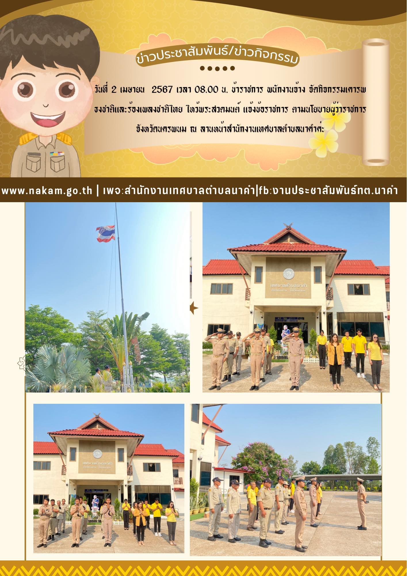 วันอังคาร ที่ 1 เมษายน 2567 เวลา 08.00 น. ข้าราชการ พนักงานจ้างและลูกจ้าง จัดกิจกรรมเคารพธงชาติและร้องเพลงชาติไทย ไหว้พระสวดมนต์ แจ้งข้อราชการ ตามนโยบายผู้ว่าราชการจังหวัดนครพนม ณ ลานหน้าสำนักงานเทศบาลตำบลนาคำค่ะ