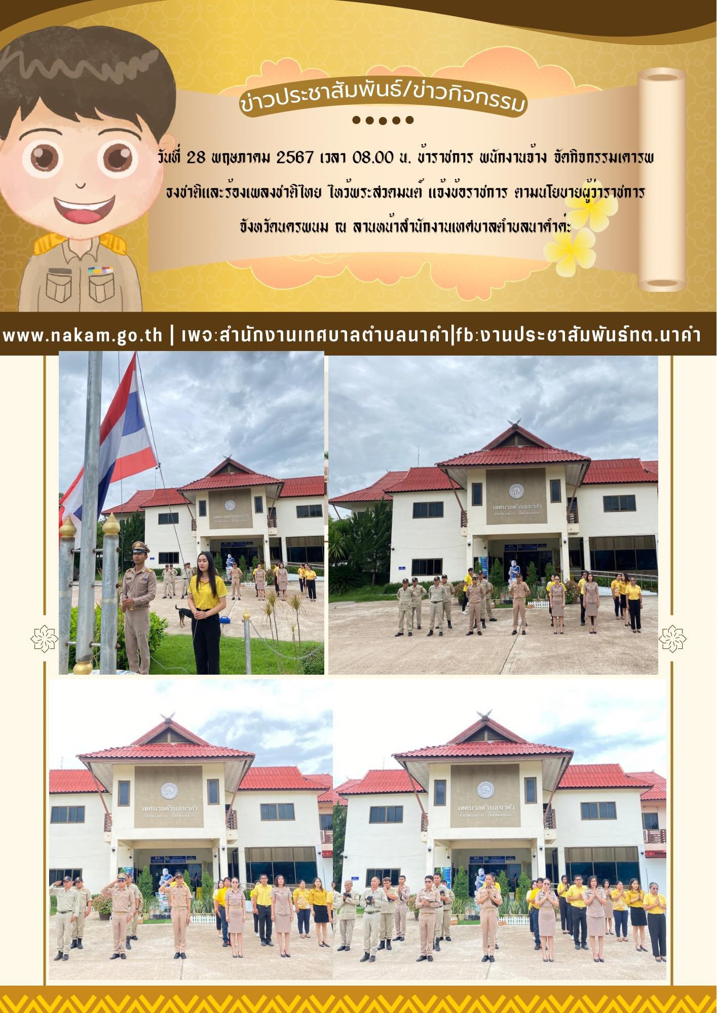 วันที่ 28 พฤษภาคม 2567 เวลา 08.00 น. ข้าราชการ พนักงานจ้างและลูกจ้าง จัดกิจกรรมเคารพธงชาติและร้องเพลงชาติไทย ณ ลานหน้าสำนักงานเทศบาลตำบลนาคำ