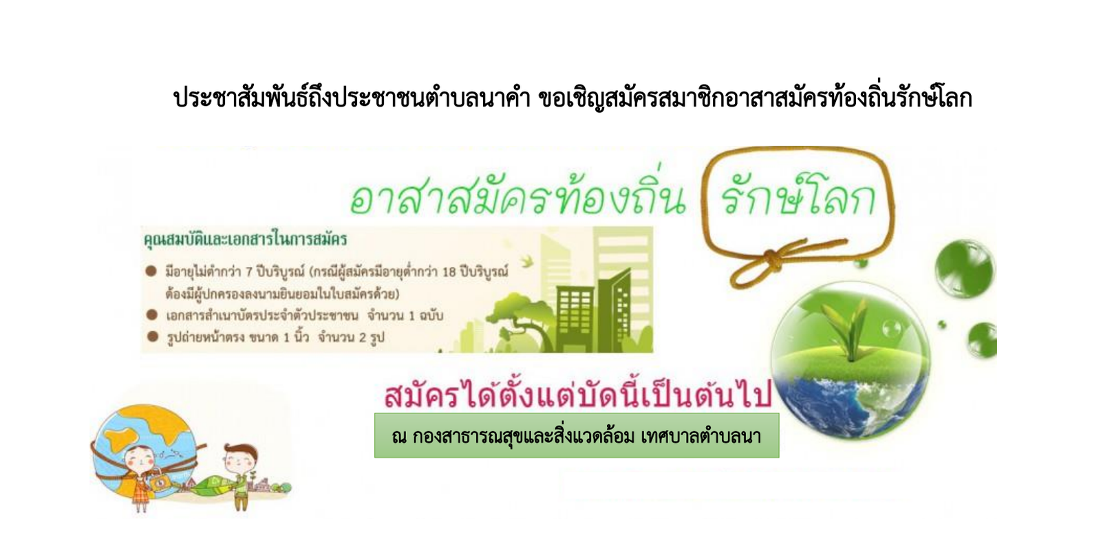 เทศบาลตำบลนาคำ เปิดรับอาสาสมัครท้องถิ่นรักษ์โลก (อถล.) คือ บุคคลที่มีความสนใจ มีความสมัครใจ มีความเสียสละและอุทิศตนในการทำงานด้านการจัดการสิ่งปฏิกูลและมูลฝอย การป้องกันและรักษาสิ่งแวดล้อมในท้องถิ่นของตนเอง