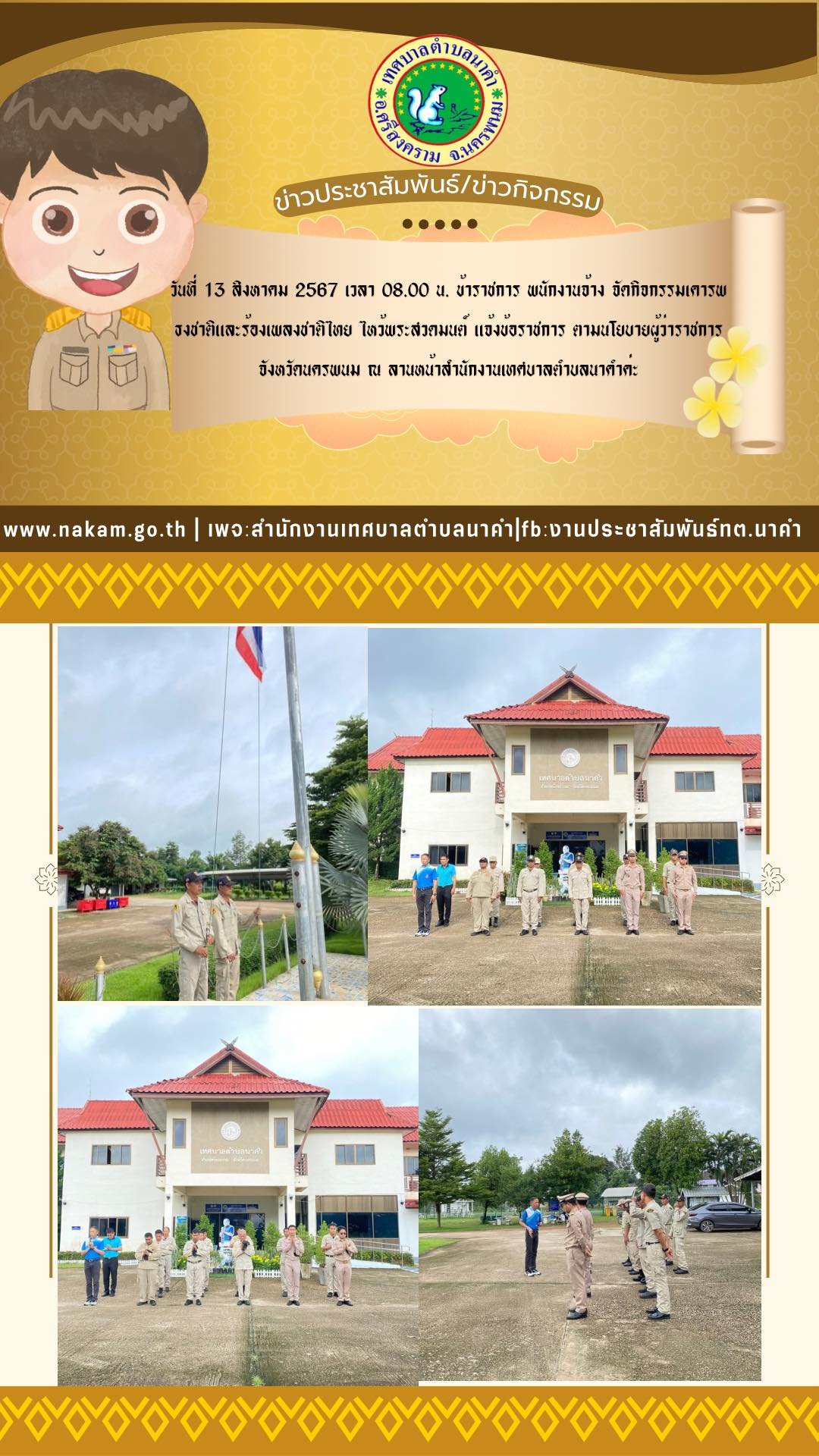 วันที่ 13 ส.ค. 2567 เวลา 08.00 น. ข้าราชการ พนักงานจ้างและลูกจ้าง จัดกิจกรรมเคารพธงชาติและร้องเพลงชาติไทย ไหว้พระสวดมนต์ ณ ลานหน้าสำนักงานเทศบาลตำบลนาคำค่ะ