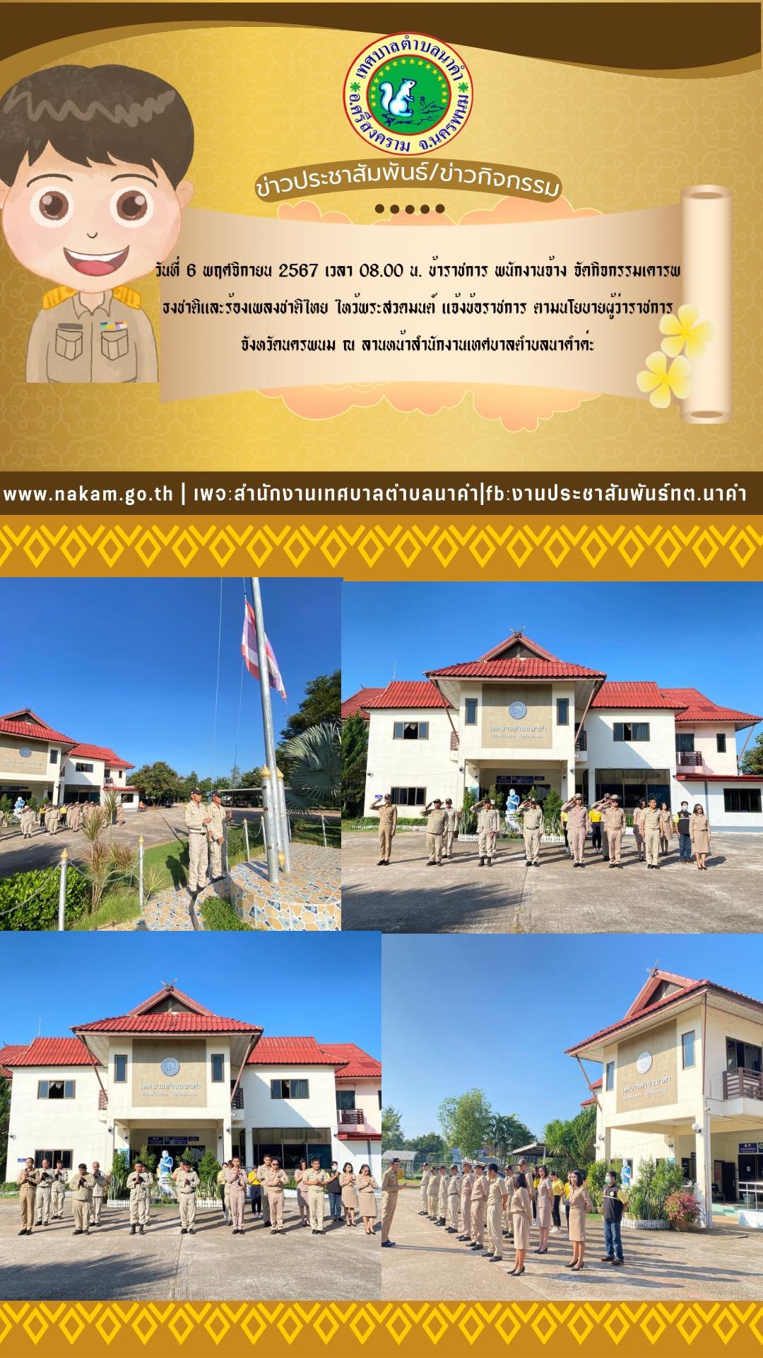 วันที่ 6 พ.ย. 2567 เวลา 08.00 น. ข้าราชการ พนักงานจ้างและลูกจ้าง จัดกิจกรรมเคารพธงชาติและร้องเพลงชาติไทย ไหว้พระสวดมนต์ ณ ลานหน้าสำนักงานเทศบาลตำบลนาคำค่ะ