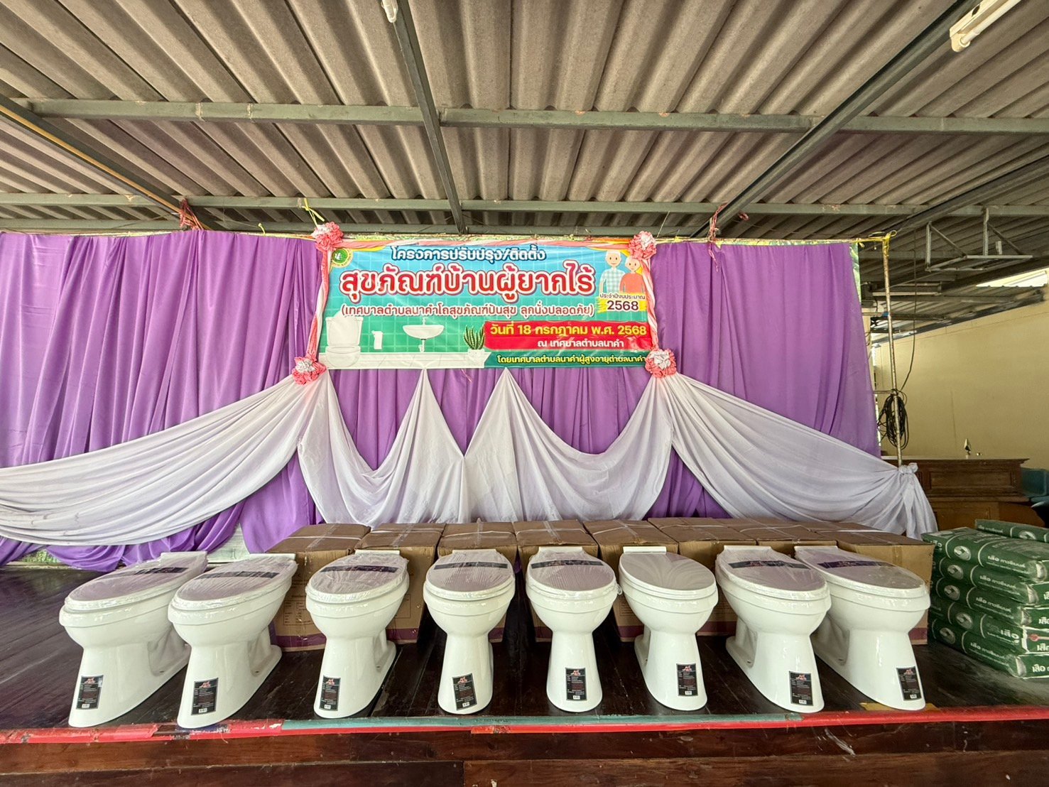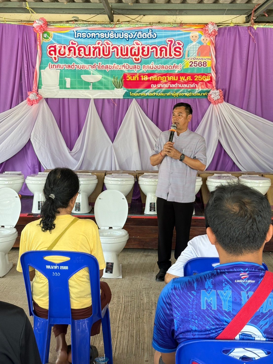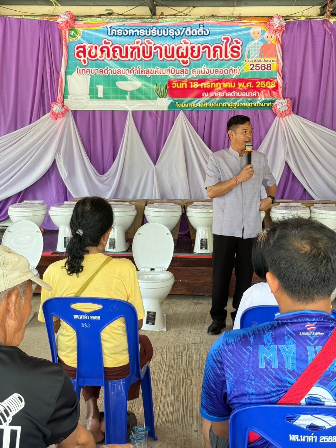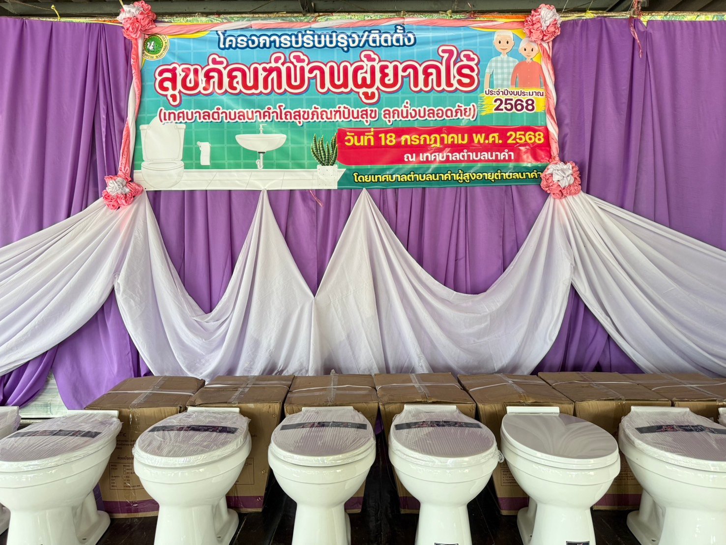 วันศุกร์ ที่ 18 กรกฎาคม 2568 เวลา 09.30 น. นายธวัชชัย ศรีทอง นายกเทศมนตรีตำบลนาคำ เป็นประธานพิธีเปิด โครงการปรับปรุง/ติดตั้งสุขภัณฑ์บ้านผู้ยากไร้ (เทศบาลตำบลนาคำโถสุขภัณฑ์ปันสุข ลุกนั่งปลอดภัย) ประจำปีงบประมาณ 2568 โดยได้มอบโถสุขภัณฑ์ให้กับบ้านผู้ยากไร้ จำนวน 19 หลังคาเรือน
